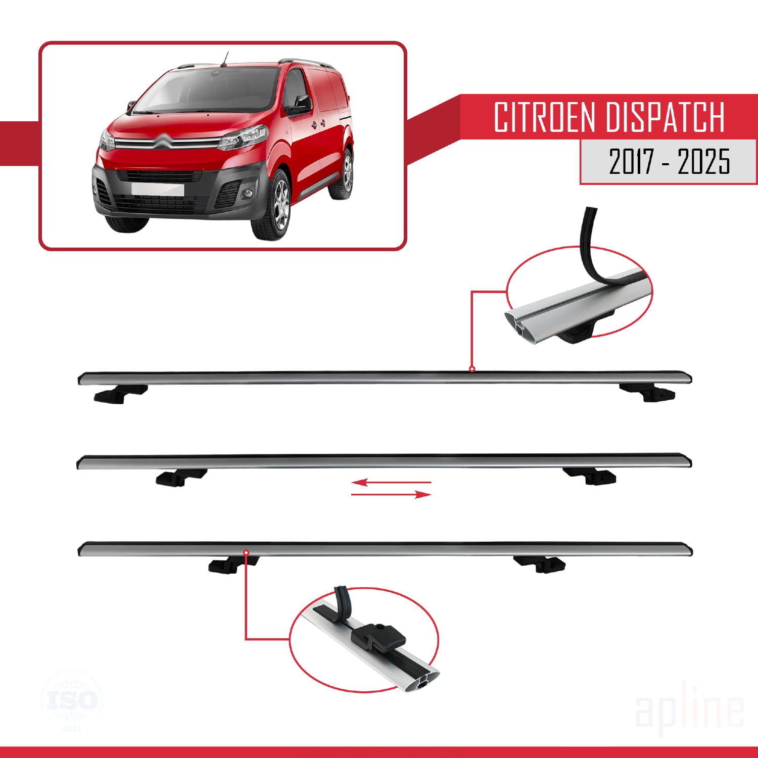 Compatible avec Citroen Dispatch (K0) 2017-2025 BASIC Model Barres de Toit Railing Porte-Bagages de Voiture Gris Aluminium 3 Barres