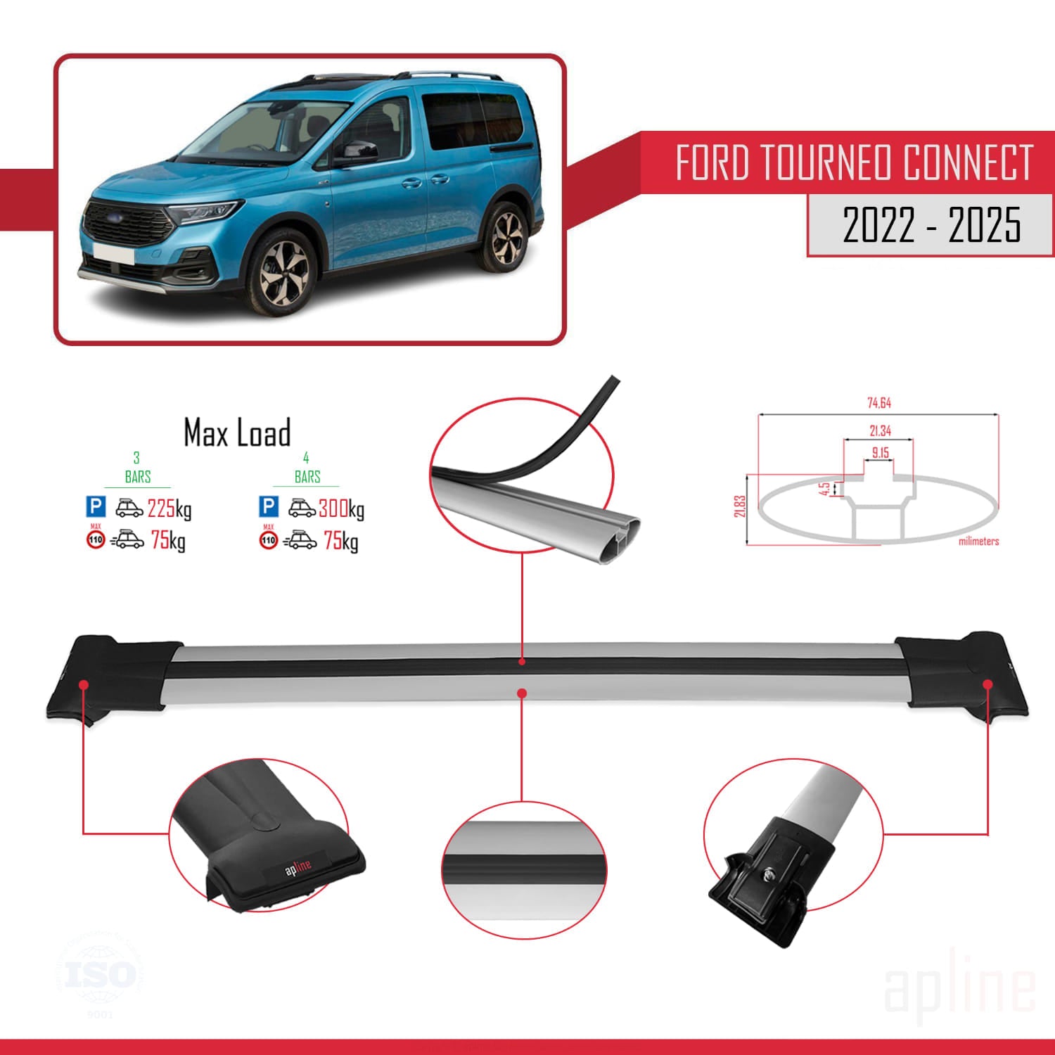Barres de toit modèle FLY Ce produit convient aux modèles présentant un espace entre le toit du véhicule et la barre de toit. Il est utilisé pour transporter des charges sur votre véhicule. Il est nécessaire pour l'assemblage du porte-vélos, du porte-skis, du coffre de toit, etc. Ce produit se monte sur les barres de toit du véhicule. Ce produit ne peut pas être utilisé dans les véhicules sans barres de toit. Il est compatible avec les modèles présentant un espace entre le toit du véhicule et les barres de toit. Il peut être fabriqué en noir ou en gris (veuillez faire attention à la couleur indiquée dans le titre de l'annonce). Les instructions d'assemblage du produit vous seront fournies dans le colis. L'installation du produit est simple. Une personne peut l'assembler sans l'aide d'un professionnel. Sauf erreur d'achat, il n'est pas nécessaire de couper les barres d'aluminium. Contenu du paquet 3 barres en aluminium (entièrement compatibles avec le véhicule indiqué dans le titre de l'annonce) 6 pièces kit de connexion de barre en aluminium. 6 pièces support de tête, 6 pièces Protecteur de support de tête en élastomère 6 pièces Support inférieur, (GF30 PA6 ou acier S 235 peint électrostatiquement pour certains véhicules) 6 pièces protecteur de pédalier en élastomère 6 boulons (+ ou ⬡) 6 écrous 1 clé Allen (si le boulon a une tête ⬡)