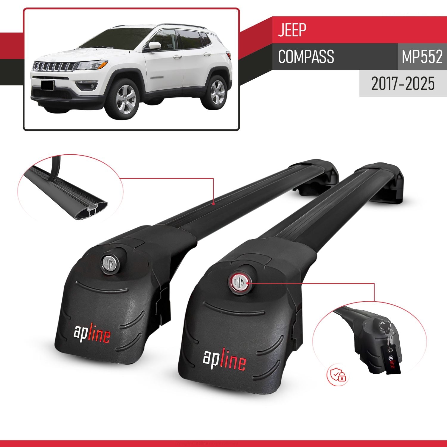 Compatible avec Jeep Compass (MP552) 2017-2025 ACE-2 modèle Barres de Toit Railing Porte-Bagages de Voiture Noir Aluminium Barres