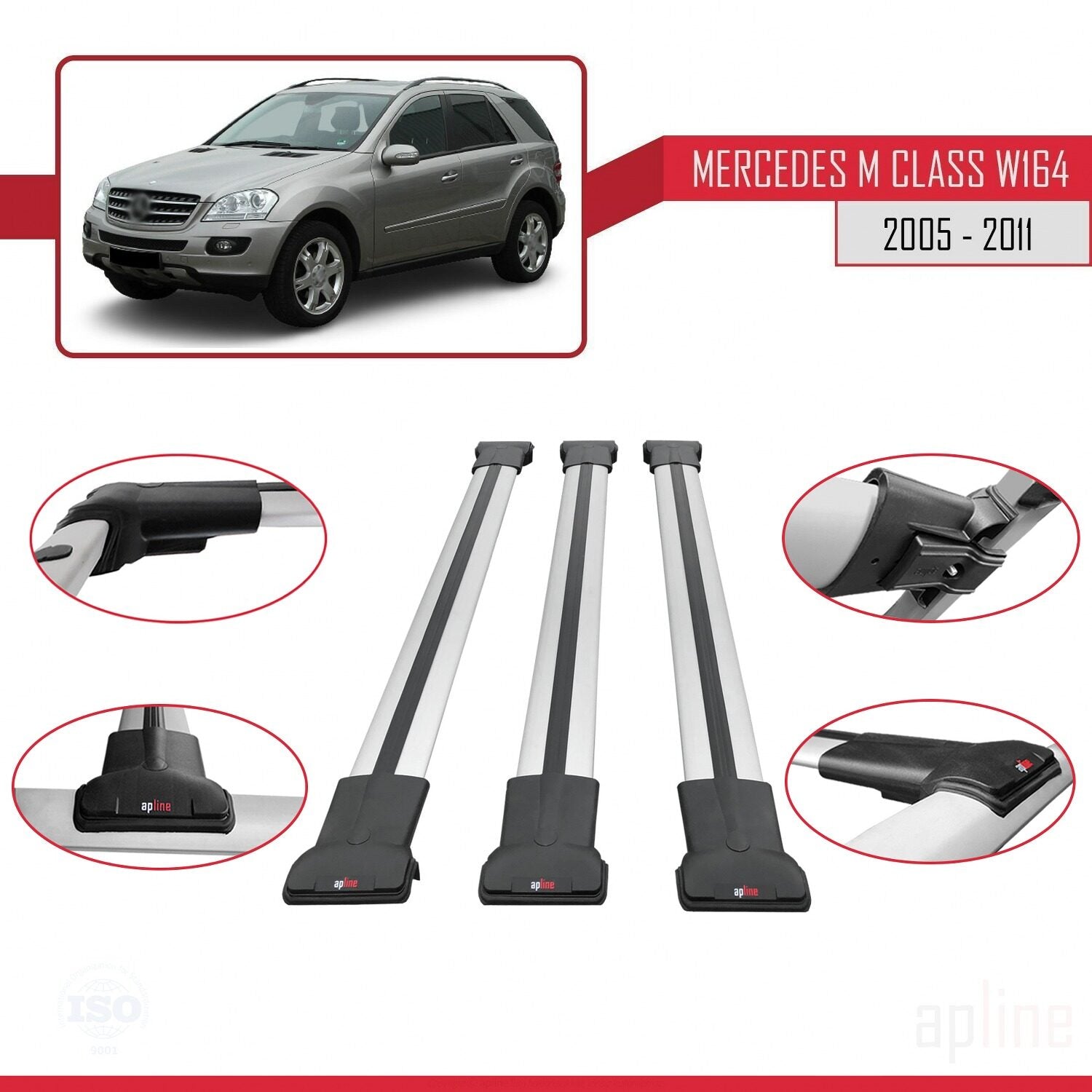 Compatible avec Mercedes Classe M 2 (W164) 2005-2011 FLY Model Barres de Toit Railing Porte-Bagages de Voiture Gris Aluminium 3 Barres