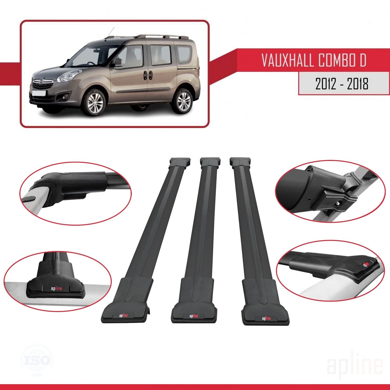 Compatible avec Vauxhall Combo D 2012-2018 FLY Model Barres de Toit Railing Porte-Bagages de Voiture Noir Aluminium 3 Barres
