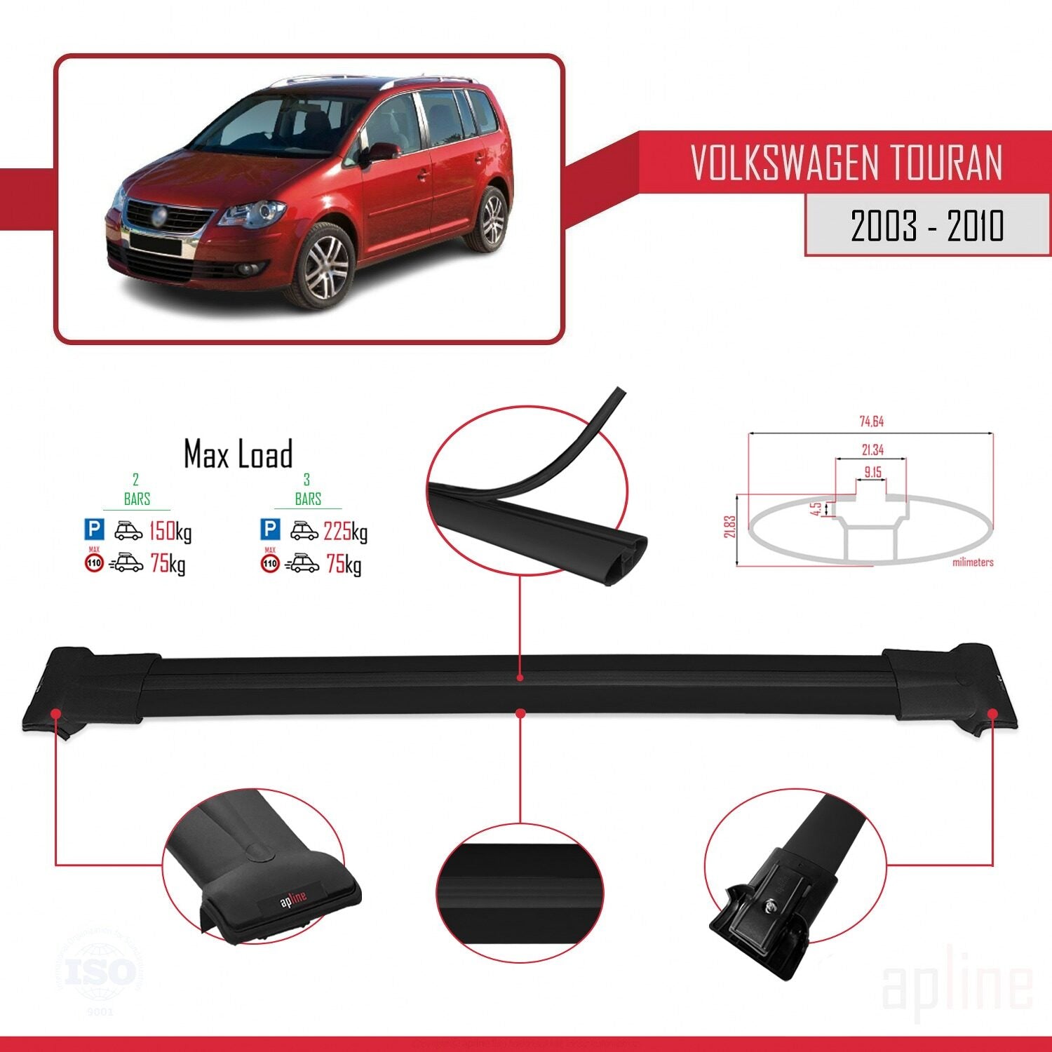 Compatible avec Volkswagen Touran (1T) Pre-Facelift 2003-2010 FLY Model Barres de Toit Railing Porte-Bagages de Voiture Noir Aluminium 2 Barres