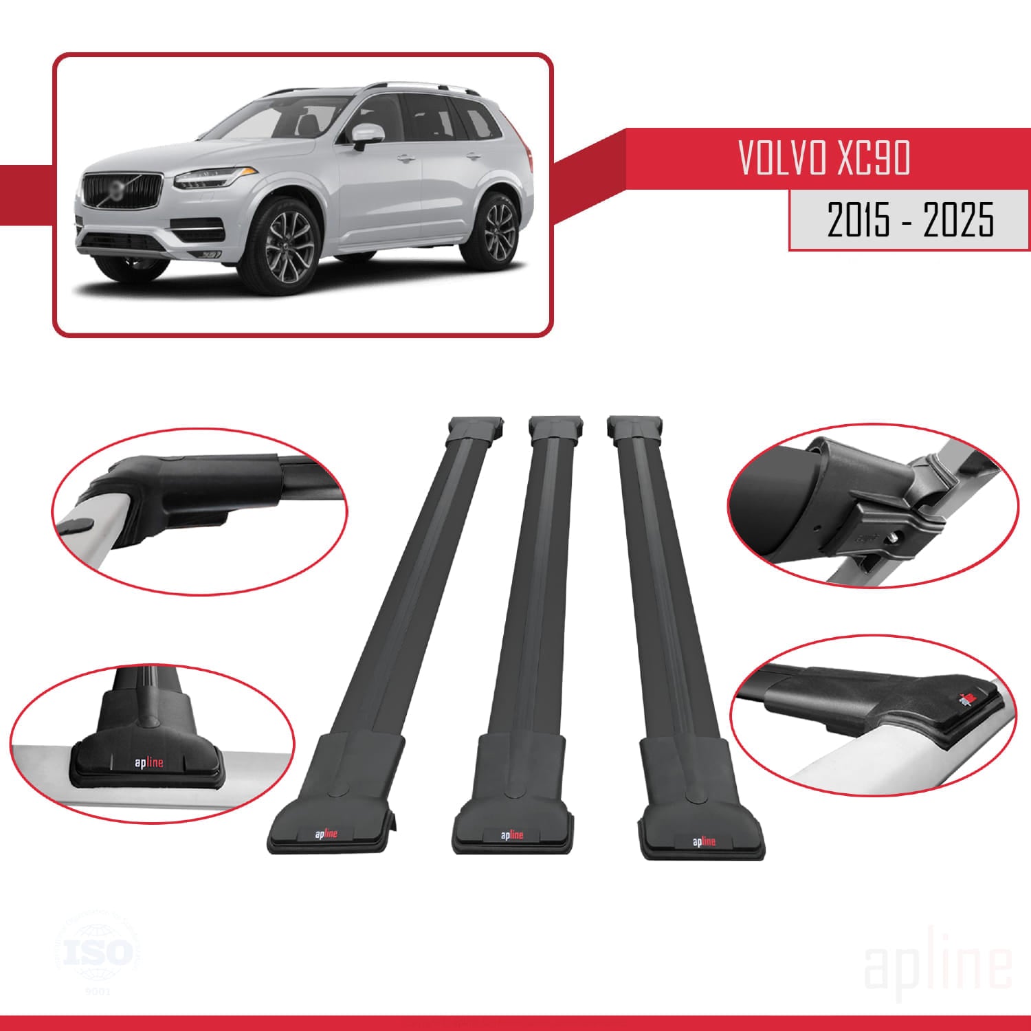 Compatible avec Volvo XC90 II 2015-2025 FLY Model Barres de Toit Railing Porte-Bagages de Voiture Noir Aluminium 3 Barres